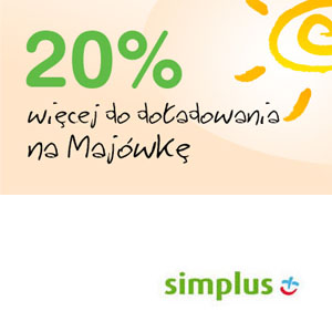 Była niedawno promocja 20% więcej w Simplusie na wiosnę, teraz czas na podobną akcję, tym razem jednak o nazwie 20% więcej, ale już na majówkę. Aby skorzystać z oferty musimy wykonać zasilenie w przedziale 50-99 PLN telefonu za pomocą internetowych doładowujących stron telkoma. Dopuszczalne jest nawet użycie wewnętrznych systemów zasilających, które występują w witrynach bankowych (mBank, Inteligo, itp).