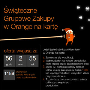 Pomarańczowy przygotował kolejną promocję na portalu społecznościowym Facebook. Tym razem jednak mamy do czynienia z akcją marketingową o nazwie Świąteczne grupowe zakupy w Orange. Na początku musimy zadeklarować kupno od 1 do 4 produktów w terminie do 21 grudnia 2011 roku. Zaliczają się do nich pakiet 1000 minut do Orange za 10 PLN na 14 dni, pakiet 600 SMS do Orange za 6 PLN na 30 dni, pakiet 100 MB za 10 PLN na 30 dni lub doładowanie konta głównego za minimum 10 PLN.