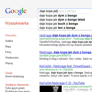 Później już tylko pozostaje nam skorzystanie z niezawodnej wyszukiwarki Google, a następnie wpisanie w pole wyszukiwania zapamiętane zdanie z piosenki, która się wcześniej spodobała. W naszym przypadku taki sprytny sposób zadziałał perfekcyjnie. W momencie wpisywania frazy daje kopa jak już pojawiła się autosugestia.