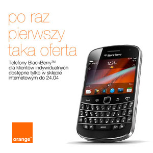 Minuty na okrągło aktywujemy kodem *110*40#. Musimy także pamiętać, że oba zasilenia musza być dokonane w okresie maksymalnie 21 dni. Teraz czas na drugą nowość w Orange. Pomarańczowy operator po raz pierwszy w swojej ofercie ma telefony marki BlackBerry dla klientów indywidualnych. Do tej pory na taki luksus mogli sobie pozwolić użytkownicy biznesowi czy też przedsiębiorcy. Kultowy BlackBerry Bold 9900 jest dostępny za 149 PLN w taryfie Pantera za 89,90 PLN, gdzie umowa jest na 2 lata z rabatem na abonament przez pierwsze 6 miesięcy. Trzeba przyznać, że jest to nareszcie normalna cena, a nie wzięta z kosmosu jak to wcześniej miało miejsce dla tego modelu.