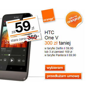 Kolejna dobra propozycja to HTC One V obniżony do wartości 59 PLN ze starych 359 PLN (w Delfinie 59,90 PLN). Warto jeszcze wspomnieć o pozostałej trójce, nieco mniej rozbudowanych słuchawek. Dodatkowo we wszystkich podanych przykładach kontrakt jest ważny 24 miesiące, czyli 2 lata.
