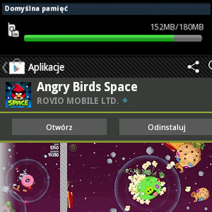 Tak było już wielokrotnie w naszym przypadku. Po instalacji najnowszej wersji Angry Birds Space Red Planet z gejzerami zauważyliśmy, że wykorzystana pamięć domyślna ma poziom 152 MB/180 MB. Po kilku minutach wynik uległ poprawieniu na właściwą wartość 126 MB/180 MB. Widać wyraźnie gołym okiem, że przez pewien czas Android zakwalifikował tą kultową grę  jako zupełnie nowy produkt. Później wręcz jakby zdał sobie sprawę z popełnionej pomyłki i wszystko poprawił. Taki błąd w przypadku telefonów z małą ilością pamięci wewnętrznej oznaczać może zwiększenie cierpliwości w kwestii kolejnych instalacji z Google Play (musimy poczekać do momentu aż wróci nam poprawna wartość zużycia danych).