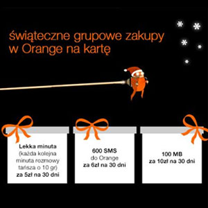 Orange z okazji Świąt przygotował bonus dla użytkowników ofert na kartę One, Pop czy Go, którzy są fanami marki na Facebooku. Jeżeli do 12 grudnia 2012 roku (najbliższej środy) zadeklarują się oni kupić jedną z trzech usług w liczbie 500 osób to będą mogli liczyć na prezent w postaci 150 SMSów do wszystkich sieci ważny 15 dni.