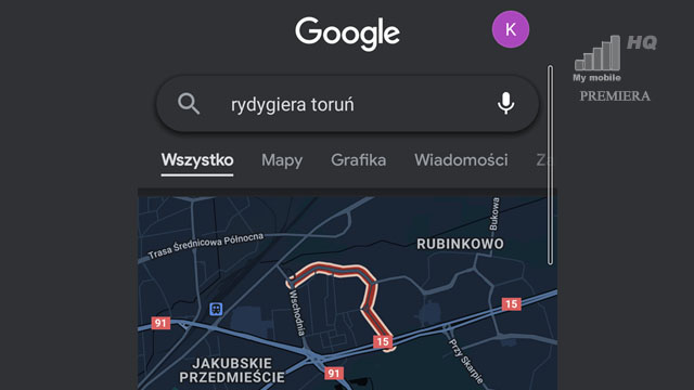 Jak w wyszukiwarce Google wpiszemy kombinację słów nazwa ulicy oraz miasta to otrzymamy wynik w niezwykle praktyczny sposób zaznaczoną całą ścieżkę jak na powyższej grafice z widgetu na Androida. Rydygiera Toruń doskonale pokazuje początek oraz koniec wybranej trasy przez użytkownika. Szybko, sprawnie i co najważniejsze mocno widocznie na tle ciemnego widoku Google Maps na bazie ustawień menu Androida 10.